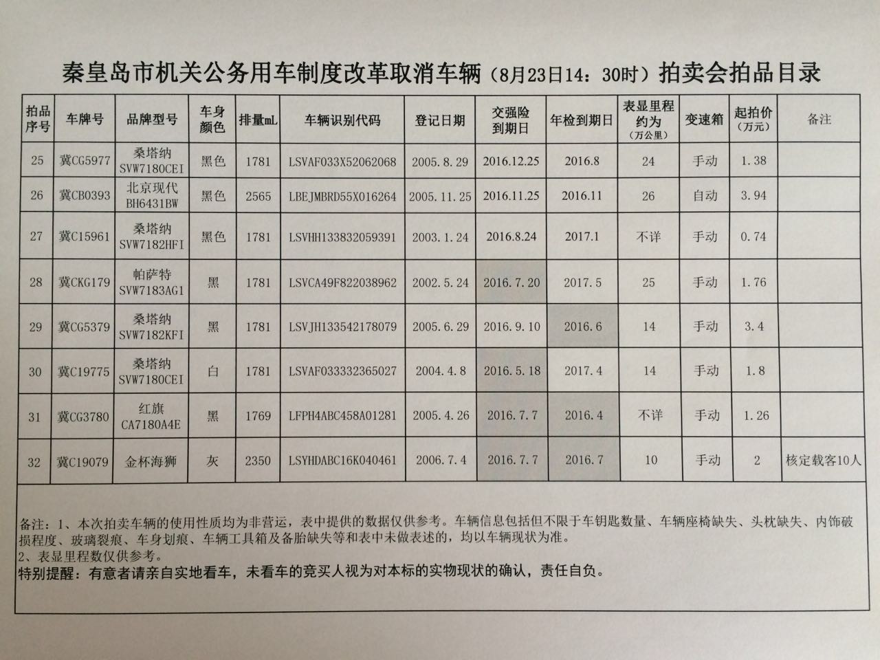 秦皇岛市机关公务用车制度改革处置车辆拍卖公告